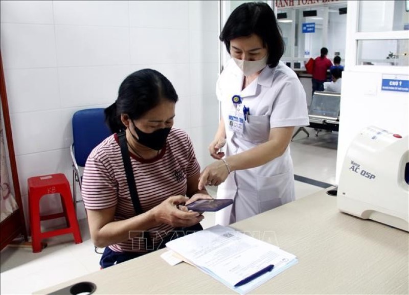 Bác sĩ hướng dẫn người bệnh tra cứu kết quả khám bệnh bằng quét QR trên điện thoại di động. Ảnh: Đồng Thúy/TTXVN